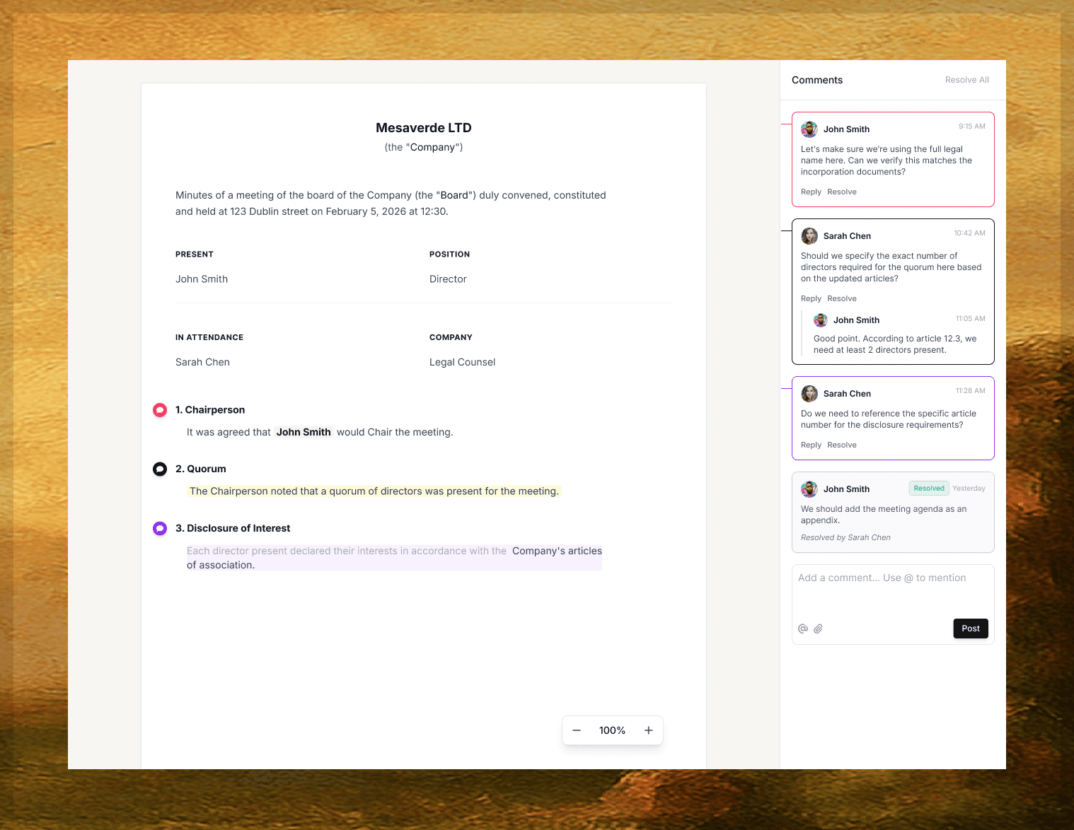 Work with legal, finance, and cosec teams. Track every edit, comment and approval through version control and audit logs. Maintain complete visibility.