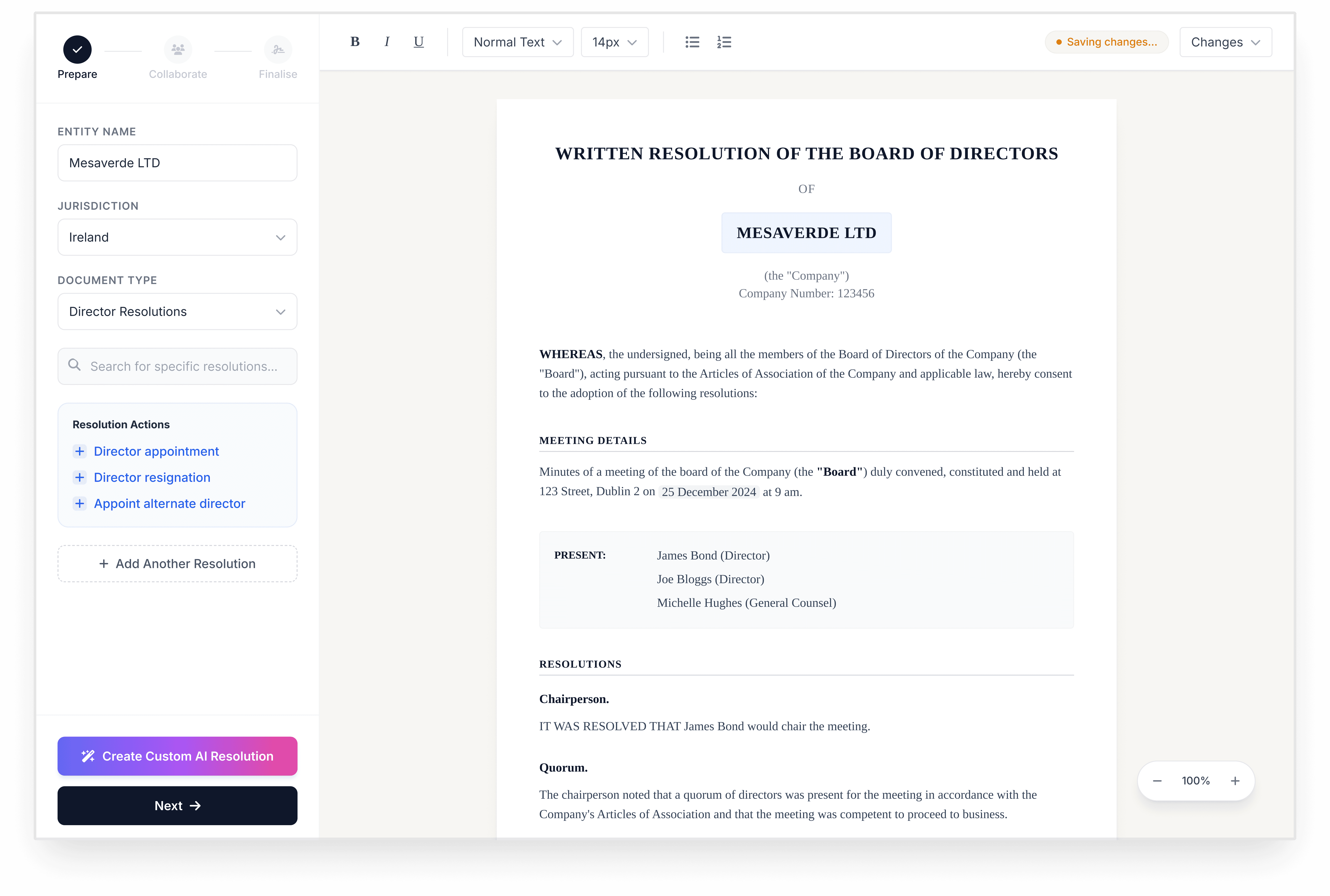 Draft, manage, and finalize resolutions in minutes, not days.